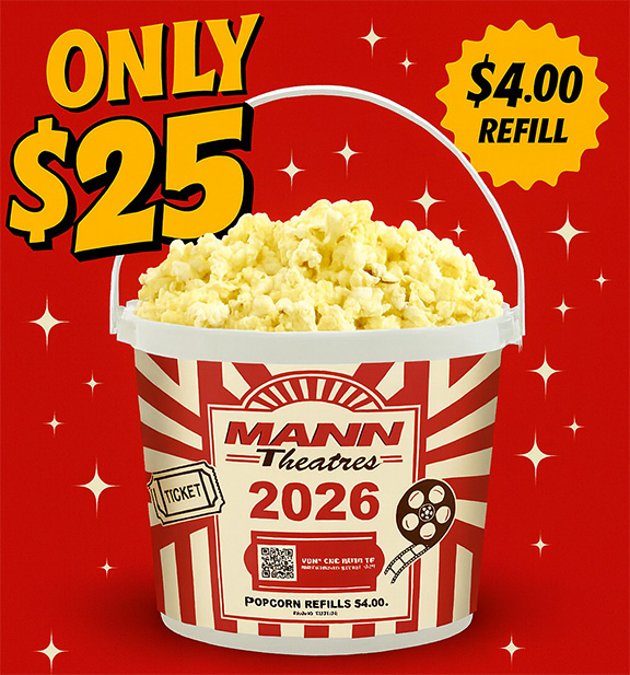 Purchase your 2026 REFILLABLE Mann Theatres popcorn bucket today!